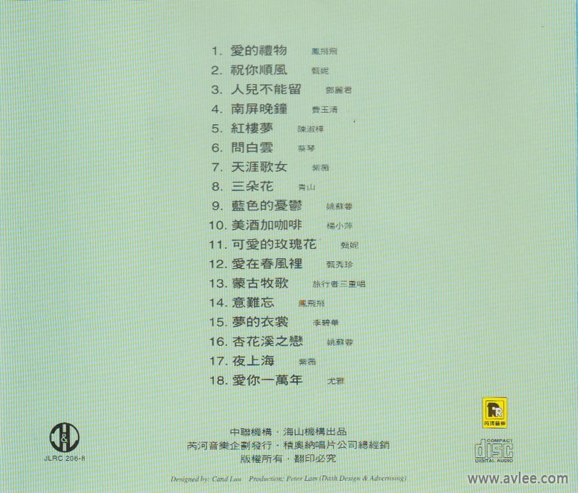 歌手名称:凤飞飞、甄妮、邓丽君、费玉清、陈淑桦、蔡琴、紫微、青山、姚苏蓉、杨小萍、甄秀珍、旅行者三重唱、李碧华、尤雅