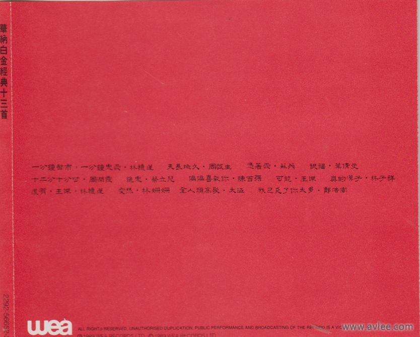 唱片名称:华纳白金经典十三首歌手名称:林忆莲 周啟生 苏芮 叶倩文 周润发 蔡立儿 陈百强 王杰 林子祥 王杰 林忆莲 林姗姗 太极 郑浩南 发行编号:2292-56652-2发行日期:1989年
