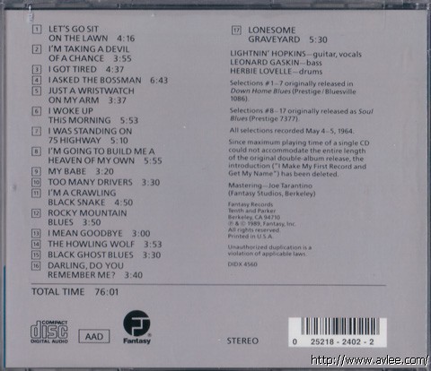 JAZZ CD名称:Double Blues 艺术家名称:Lightnin Hopkins发行公司:Fantasy发行编号:FCD-24702-2发行日期:1990-06-12商品编号:001234