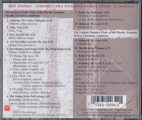 JAZZ CD名称:Aishinka 艺术家名称:Ivan Spassov发行公司:Concord Records发行编号:CCD-42034发行日期:1996-09-10商品编号:001239