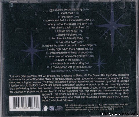 JAZZ CD名称:Ballad of the Blues 艺术家名称:Jo Stafford发行公司:Feinery发行编号:FCD-3102-2发行日期:2003-09-09商品编号:001102商品单价:85元