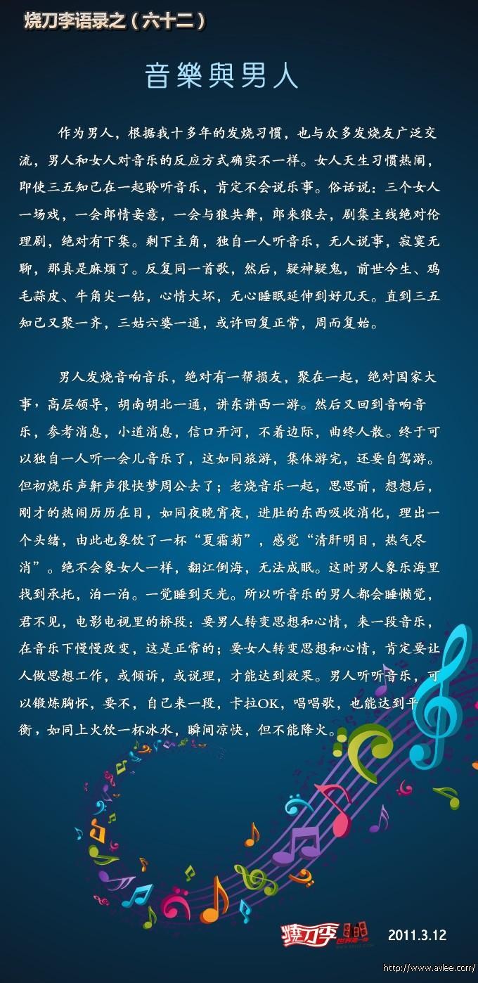 男人发烧音响音乐,绝对有一帮损友,聚在一起,绝对国家大事,高层领导,胡南胡北一通,讲东讲西一游,然后又回到音响音乐,参考消息,小道消息,信口开河,不着边际,曲终人散。终于可以独自一人听一会儿音乐了,这如同旅游,集体游完,还要自驾游。但初烧乐声鼾声很快梦周公去了;老烧音乐一起,思思前,想想后,刚才的热闹历历在目,如同夜晚宵夜,进肚的东西吸收消化,理出一个头绪,由此也象饮了一杯“夏霜菊”,感觉“清肝明目,热气尽消”。绝不会象女人一样,翻江倒海,无法成眠。这时男人象乐海里找到承托,泊一泊。一觉睡到天光。所以听音乐的男人都会睡懒觉,君不见,电影电视里的桥段:要男人转变思想和心情,来一段音乐,在音乐下慢慢改变,这是正常的;要女人转变思想和心情,肯定要让人做思想工作,或倾诉,或说理,才能达到效果。男人听听音乐,可以锻炼胸怀,要不,自己来一段,卡拉OK,唱唱歌,也能达到平衡,如同上火饮一杯冰水,瞬间凉快,但不能降火。