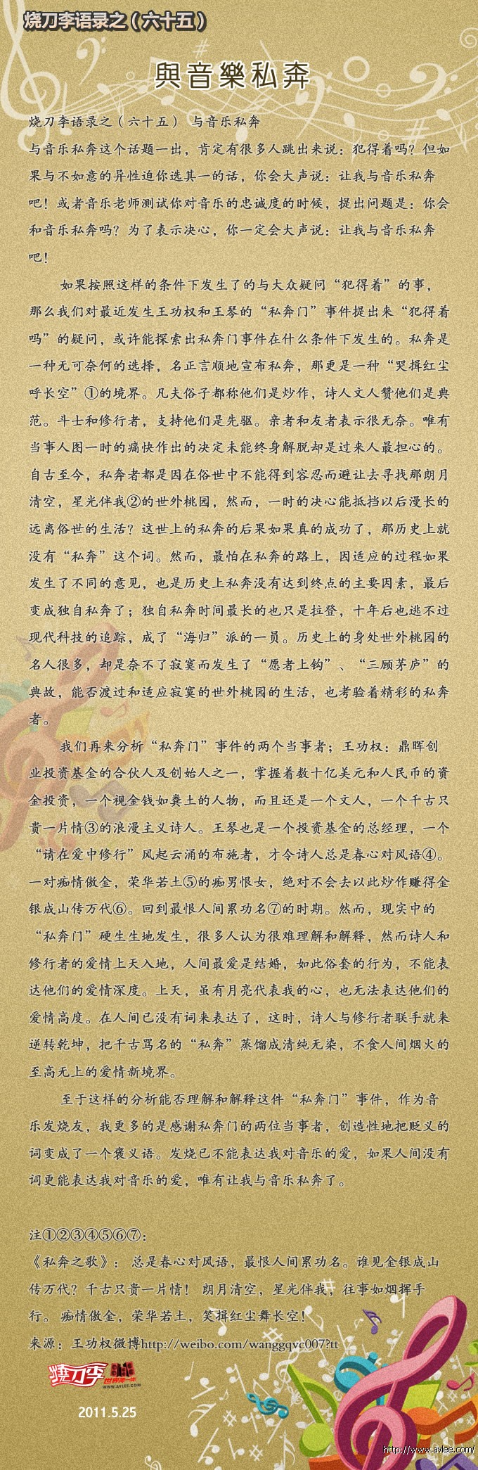 至于这样的分析能否理解和解释这件“私奔门”事件,作为音乐发烧友,我更多的是感谢私奔门的两位当事者,创造性地把贬义的词变成了一个褒义语。发烧已不能表达我对音乐的爱,如果人间没有词更能表达我对音乐的爱,唯有让我与音乐私奔了。