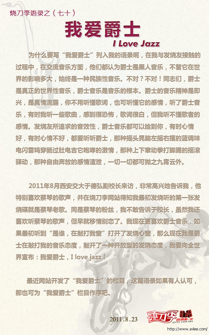 最近网站开发了“我爱爵士”的栏目,这篇语录如果有人认可,那也可为“我爱爵士”栏目作序吧。
