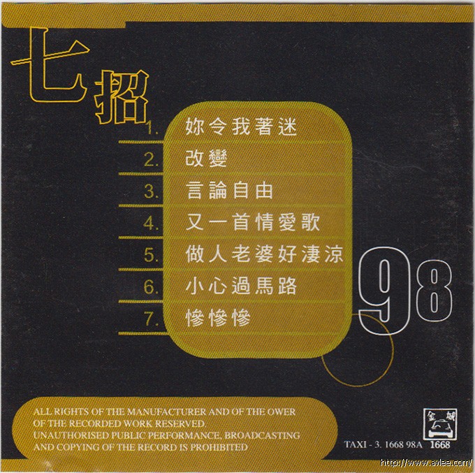 唱片名称:夏金城 七招歌手名称:夏金城发行公司:金城唱片发行编号:TAXI-3.166898A发行日期:1998年