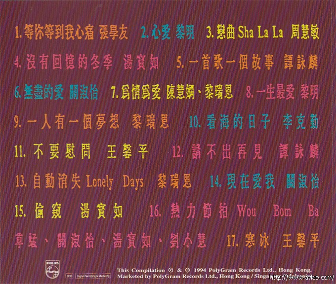 唱片名称:宝丽金群星 非常精选歌手名称:宝丽金群星 非常精选发行公司:宝丽金发行编号:522771-2发行日期:1994年