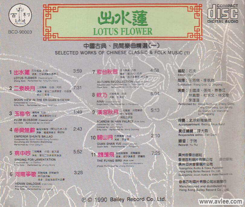 唱片名称: 出水莲 中国古典、民间乐曲精选(一)发行公司:百利发行编号:BCD-90003发行日期:1990年