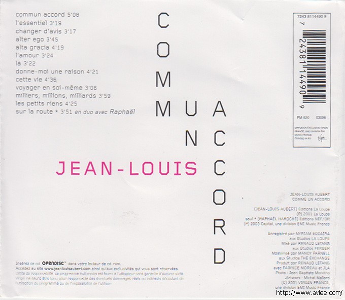 唱片名称:Comme un Accord艺术家名称:Jean-Louis Aubert 发行公司: Virgin Records发行编号:724381144909发行日期:2001年