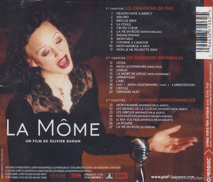 唱片名称:Bande Originale Du Film艺术家名称:La môme发行公司:EMI 发行编号:094638610625发行日期:2007年