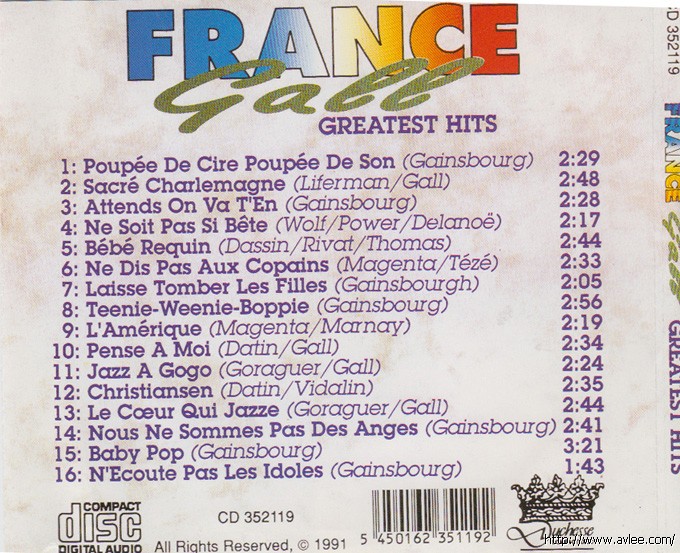 唱片名称:Greatest Hits 艺术家名称:France Gall发行公司:ALL RIGHTS 发行编号:CD 352119发行日期:1991年