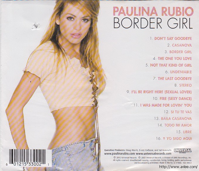 唱片名称:Border Girl艺术家名称:Paulina Rubio 发行公司:Umvd Labels 发行编号:1533302-2发行日期:2002年
