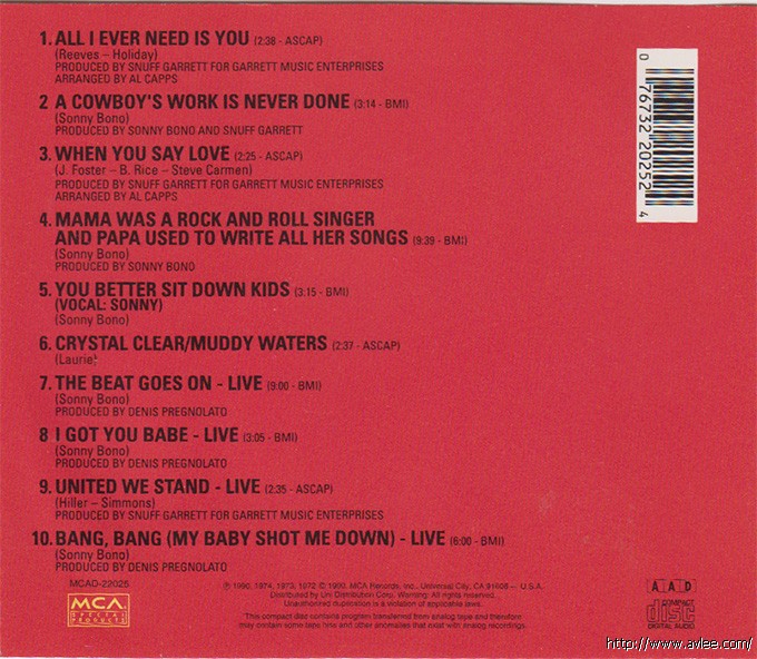 唱片名称:ALL I EVER NEED IS YOU艺术家名称:Sonny & Cher发行公司:MCA发行编号:MCAD-22025发行日期:1990年