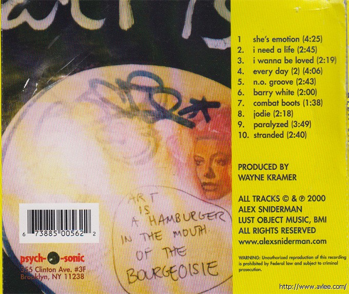 唱片名称:Alex Sniderman艺术家名称:Alex Sniderman发行公司:Psycho Sonic发行编号:673885005622发行日期:2000年