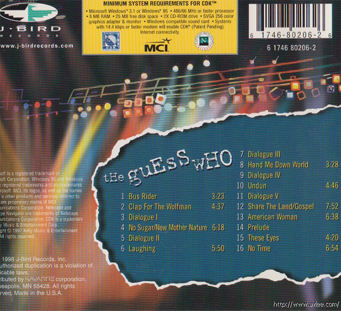 唱片名称: The Spirit Lives On艺术家名称:The Guess Who发行公司:J-Bird Records发行编号:6174680206-2发行日期:1998年
