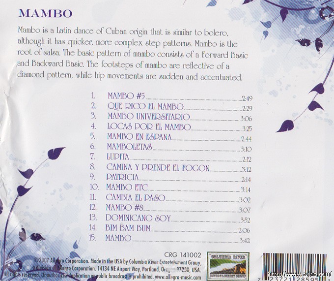 唱片名称:Ballroom Latin Dance: Mambo 艺术家名称:Various Artists 发行公司:Columbia River发行编号:CRG 141002发行日期:2007年