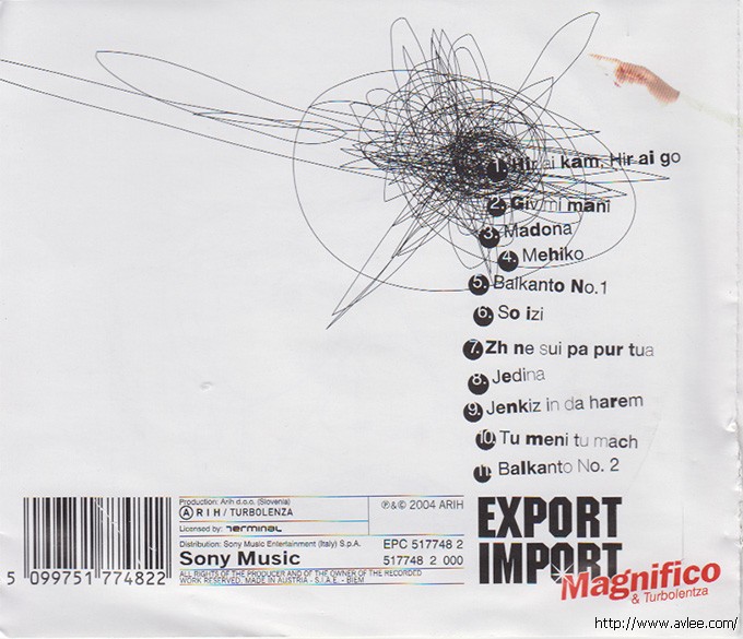 唱片名称:Export Import艺术家名称:Magnifico & Turbolentza发行公司:Arih发行编号:EPC 5177482发行日期:2004年