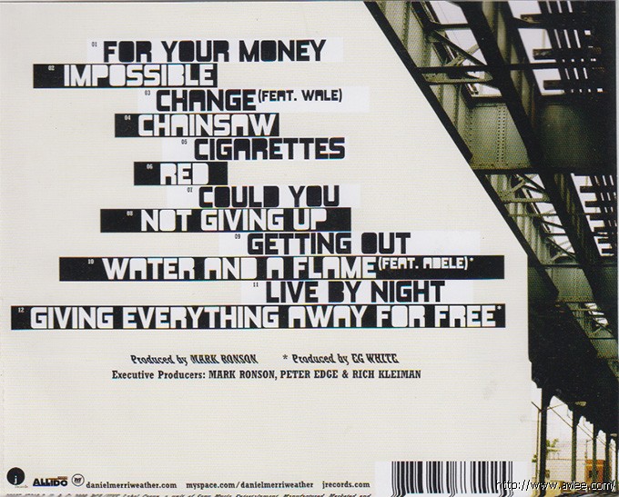 唱片名称:Love & War艺术家名称:Daniel Merriweather发行公司:RCA发行编号:88697-47319-2发行日期:2009年