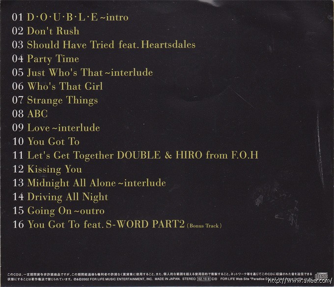 唱片名称:Vision艺术家名称:Double (2) 发行公司:For Life Records发行编号:FLCF-3918发行日期:2002年