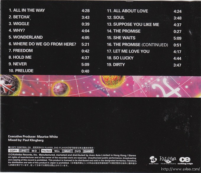 唱片名称:The Promise艺术家名称:Earth, Wind & Fire 发行公司:Kalimba Records发行编号:AVTCD-95749发行日期:2003年