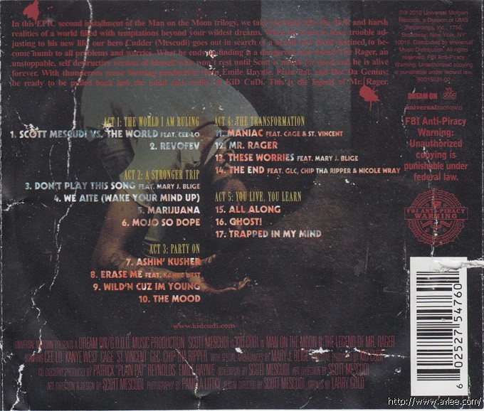 唱片名称:Man On The Moon 2: The Legend of Mr. Rager艺术家名称: Kid Cudi发行公司: Universal Motown发行编号:B0015031-02发行日期:2010年