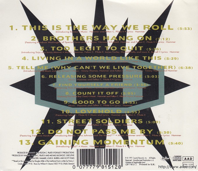 唱片名称:Too Legit To Quit艺术家名称:MC Hammer 发行公司:EMI Special Products 发行编号:CDP 7981512发行日期:1991年