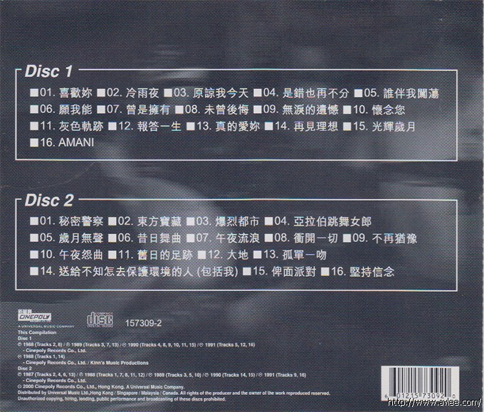 唱片名称:Beyond best of millennium歌手名称:Beyond发行公司:CINEPOLY发行编号:157309-2发行日期:2000年