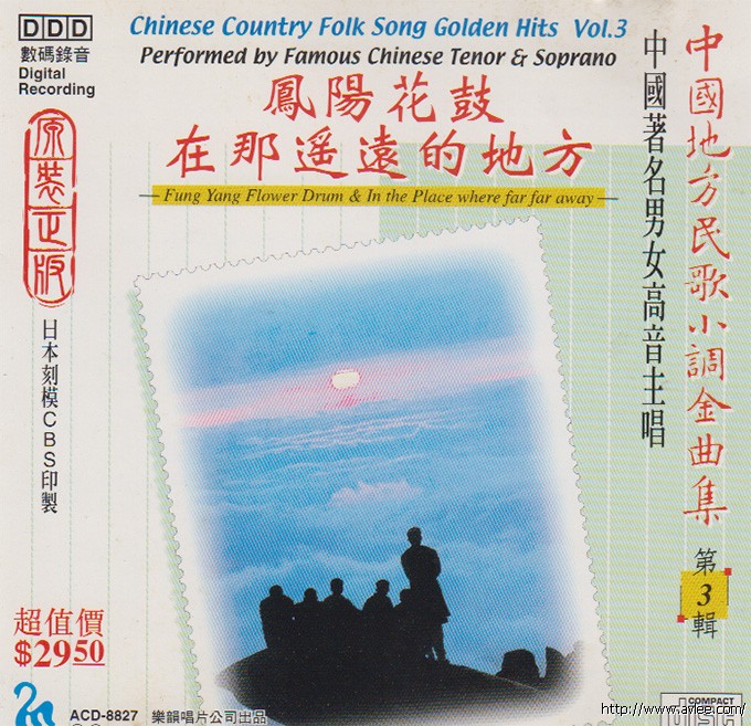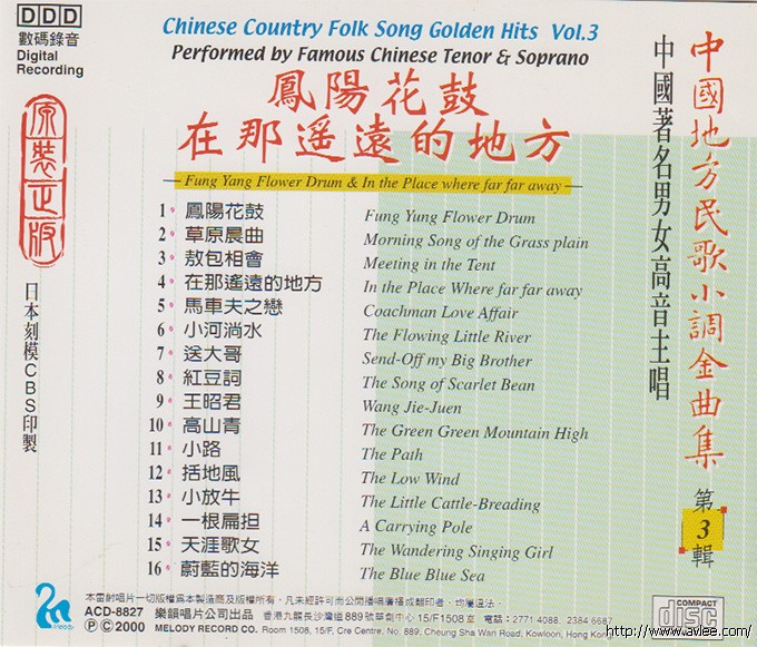 唱片名称:中国地方民歌小调金曲集 第3辑歌手名称:中国著名男女高音主唱发行公司:乐韵唱片发行编号:ACD-8827发行日期:2000年