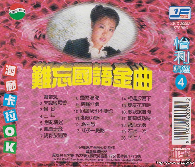 唱片名称:难忘国语金曲 精选4歌手名称:怡利发行公司:金华唱片发行编号:CCD 2009A发行日期:2009年