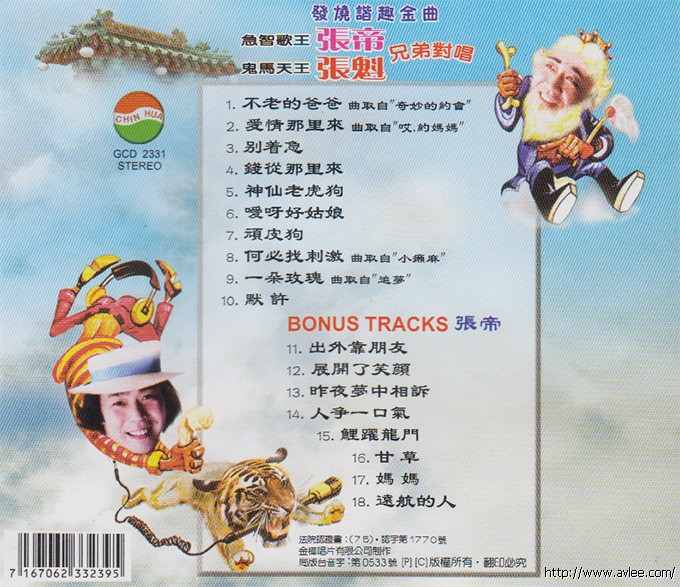 唱片名称:发烧谐趣金曲歌手名称:张帝 张魁发行公司:金华唱片发行编号:GCD 2331