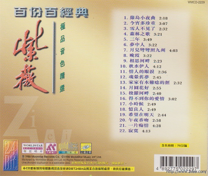 唱片名称:百份百经典 极品音色精选歌手名称:紫薇发行公司:24Bit发行编号:WMCD-2229发行日期:1988年