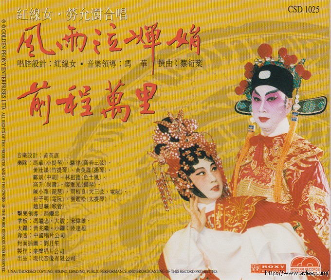 唱片名称:风雨泣婵娟 前程万里歌手名称:红线女 劳允澍发行公司:现代音像发行编号:CSD 1025