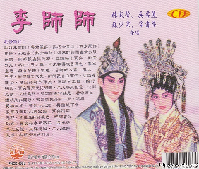 唱片名称:李师师歌手名称:林家声 吴君丽 苏少棠 李香琴发行公司:风行唱片发行编号:FHCD 4083发行日期:2003年
