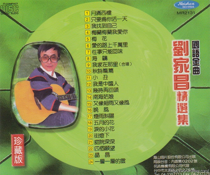 唱片名称:刘家昌精选集 国语金曲歌手名称:刘家昌发行公司:海山唱片发行编号:MR2131