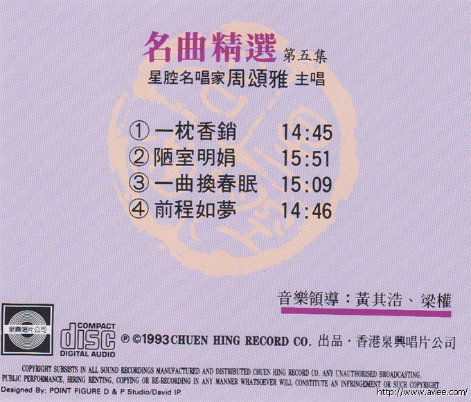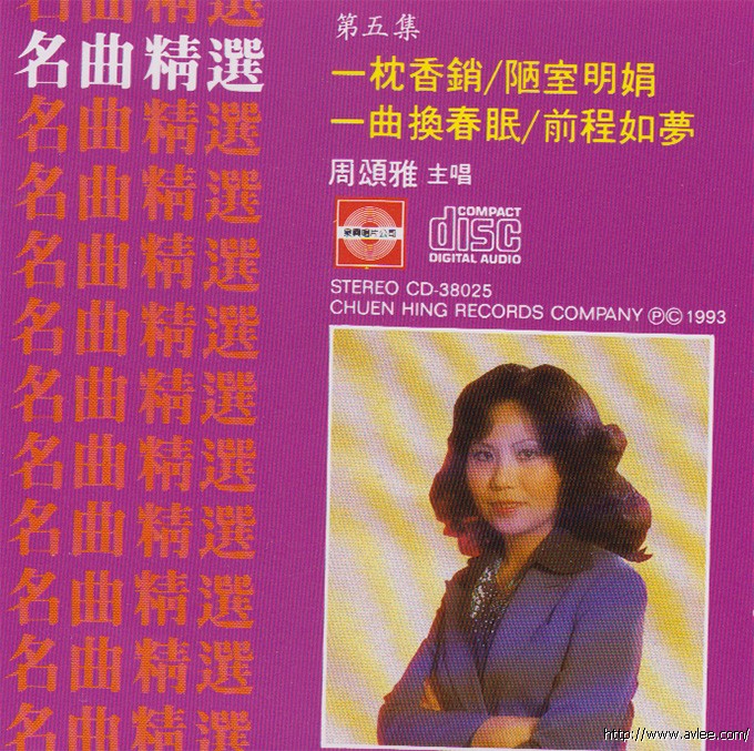 唱片名称: 星腔名曲精选 第五集 歌手名称: 周颂雅发行公司:香港泉兴唱片发行编号:CD 38025发行日期:1993年