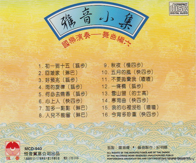 唱片名称:雅音 小集(舞曲编六)歌手名称:国乐演奏发行公司:恒音发行编号:MCD-940