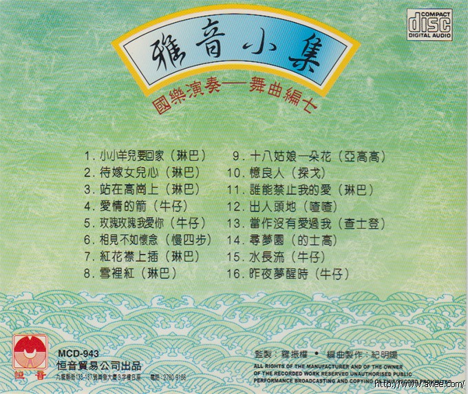 唱片名称:雅音 小集(舞曲编七)歌手名称:国乐演奏发行公司:恒音发行编号:MCD-943