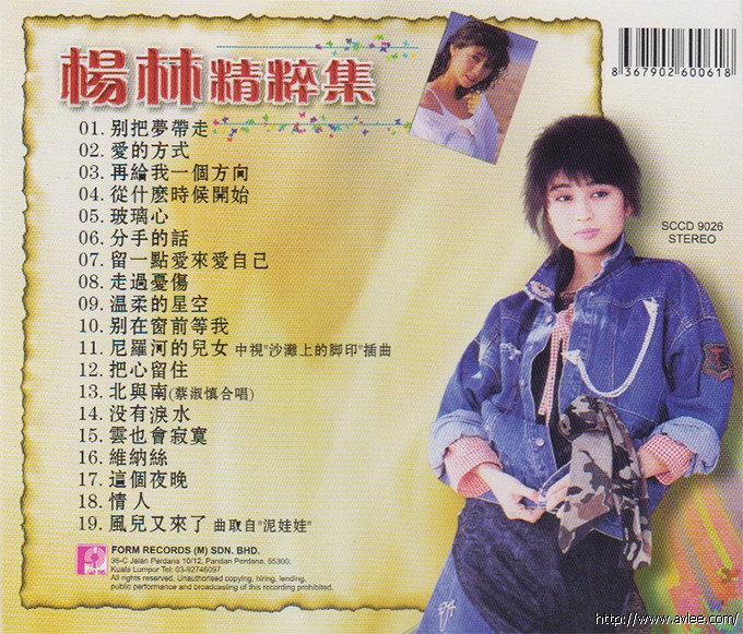 唱片名称:杨林精粹集歌手名称:杨林发行公司:FORM RECORDS发行编号:SCCD 9026
