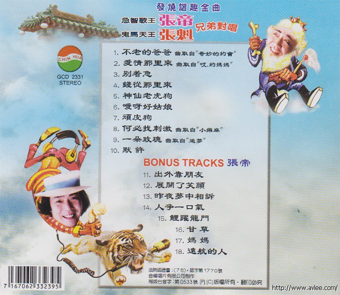 唱片名称:张帝张魁兄弟对唱 发烧谐趣金曲歌手名称:张帝张魁发行公司:金华唱片发行编号:GCD 2331