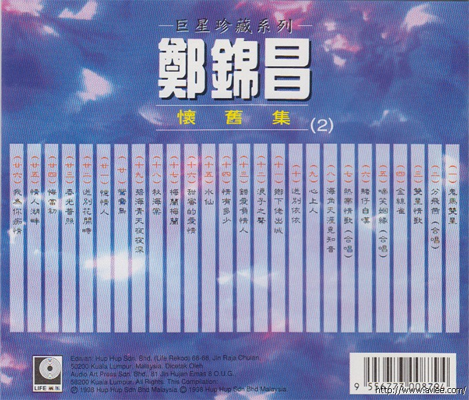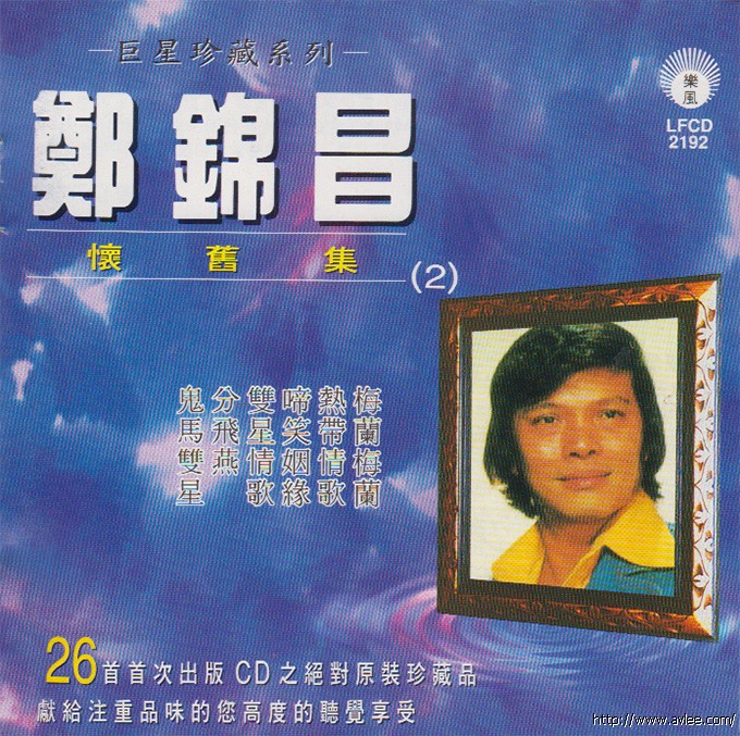 唱片名称:巨星珍藏系列怀旧集(2)歌手名称:郑锦昌 发行公司:LIFE发行编号:LFCD 2192发行日期:1998年