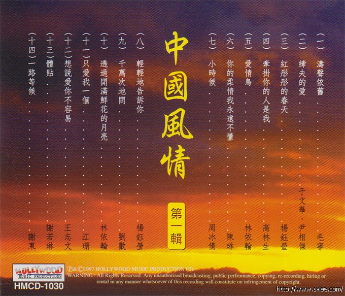 唱片名称:中国风情第一辑发行公司:HOLLYWOOD发行编号:HMCD-1030发行日期:1997年