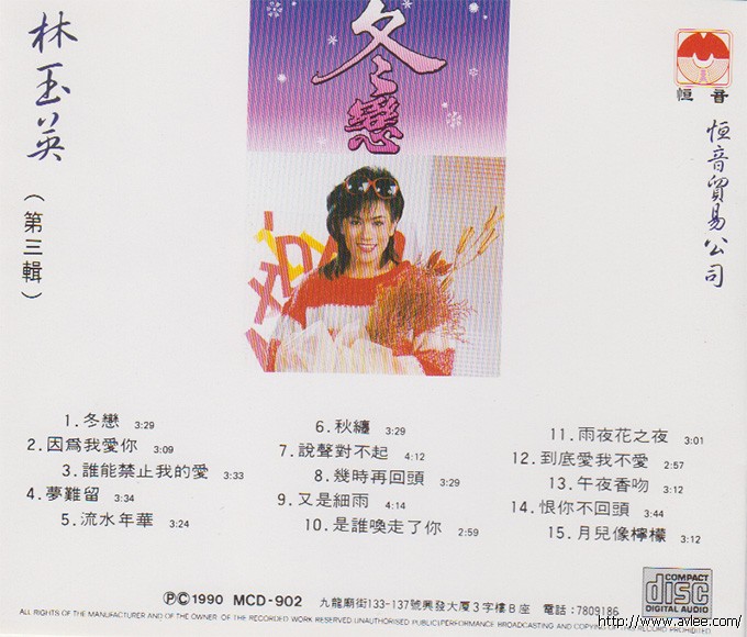 唱片名称:林玉英(第三辑) 冬恋歌手名称:林玉英发行公司:恒音贸易公司发行编号:MCD-902发行日期:1990年