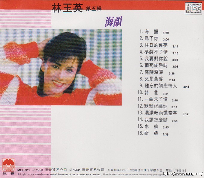 唱片名称:林玉英第五辑 海韵歌手名称:林玉英发行公司:恒音贸易公司发行编号:MCD-911发行日期:1991年