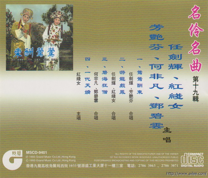 唱片名称:名作名曲 第十九辑歌手名称:任剑辉 红线女 芳艳芬 何非凡 邓碧云发行编号:MSCD-9401发行日期:1993年