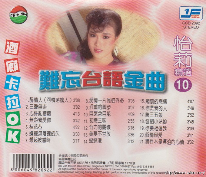 唱片名称:难忘国语金曲10歌手名称:怡利发行公司:金华唱片发行编号:GCD 2092