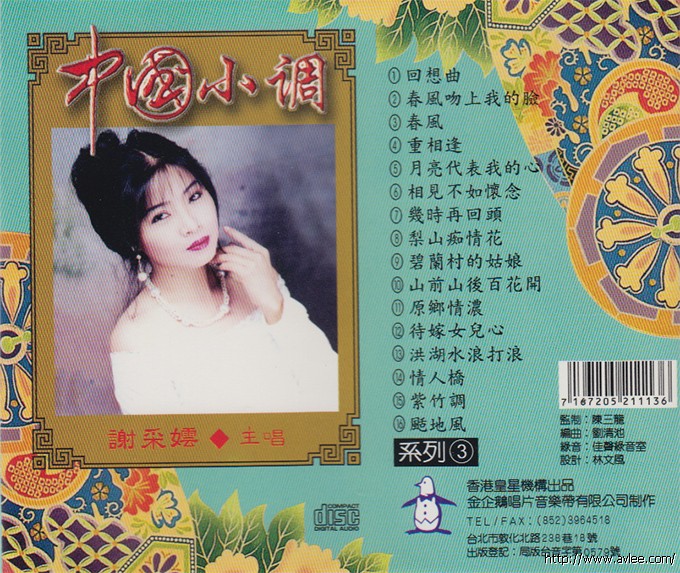 唱片名称:谢采妘 中国小调3歌手名称:谢采妘发行公司:香港皇星发行编号:GCD 2052