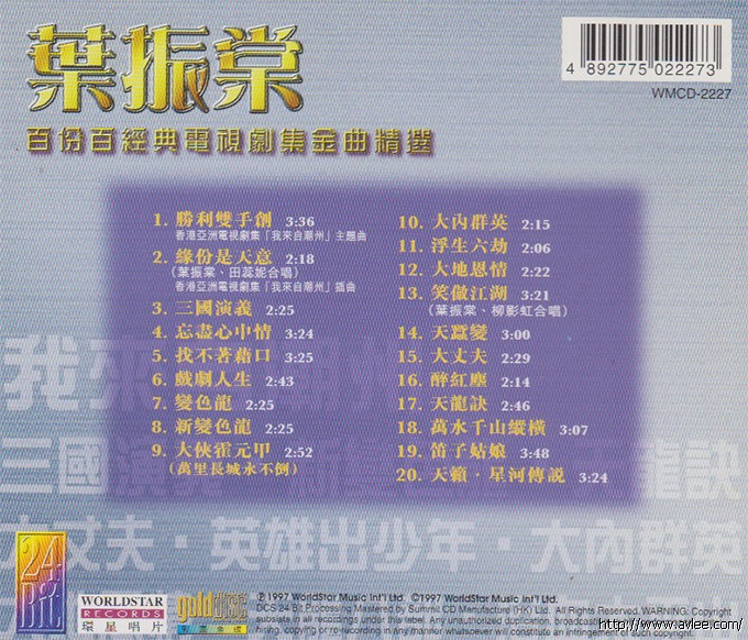 唱片名称:叶振荣 百份百经典电视剧集金典精选歌手名称:叶振荣发行公司:24 BIT 发行编号:WMCD-2227发行日期:1997年