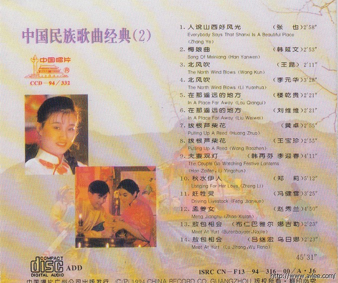 唱片名称:中国民歌歌曲经典(2)发行公司:中国唱片发行编号:CCD-94/332发行日期:1994年