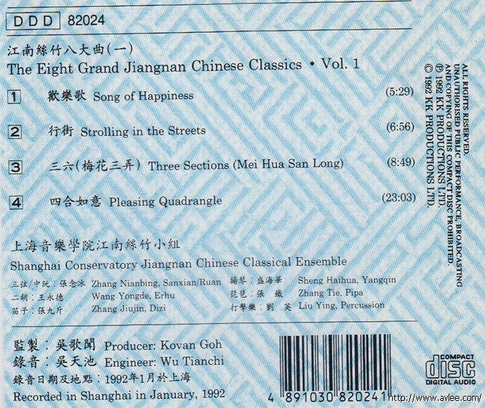 唱片名称:江南丝竹八大曲(一)歌手名称:上海音乐学院江南丝竹小组发行编号:DDD 82024发行日期:1992年