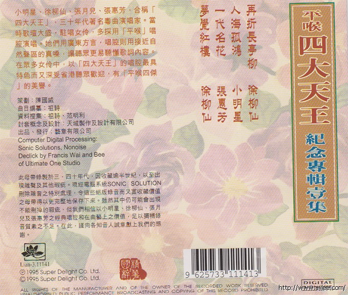 唱片名称:平喉四大天王纪念专辑壹集歌手名称:徐柳仙 小明星 张惠芳 徐柳仙发行公司:LIAN发行编号:LIAN-3.11141发行日期:1995年