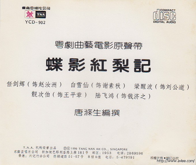 唱片名称:蝶影红梨记歌手名称:任剑辉 白雪仙 梁醒波 靓次伯 陆飞鸿发行公司:东南亚唱片发行编号:YCD-902发行日期:1990年